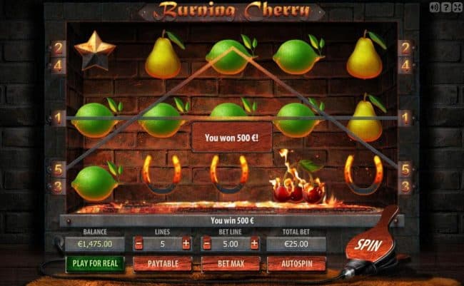 Burning Cherry HD online slot machine, a fun 5 pay line, 5 reel online video slot machine. Game icons including horseshoes, grapes and pears completely conveys the main fruit theme. Utilizing apples, bananas, lemons and flaming cherries we grade this Viaden produced slot machine 4 out of five for putting this together. Burning Cherry HD allows you the ability of playing for a minumum of $0.10 per spin. Going further you can also include all 5 lines to place a bet to the largest of $25. Hitting many star symbols will land you a large pay. You will note that on a lot of slot machines having more than two scatter symbols usually starts a slot feature game. Slots such as Empire's Glory, Maya Pyramid and Cherry-Go-Round have the same slot design.