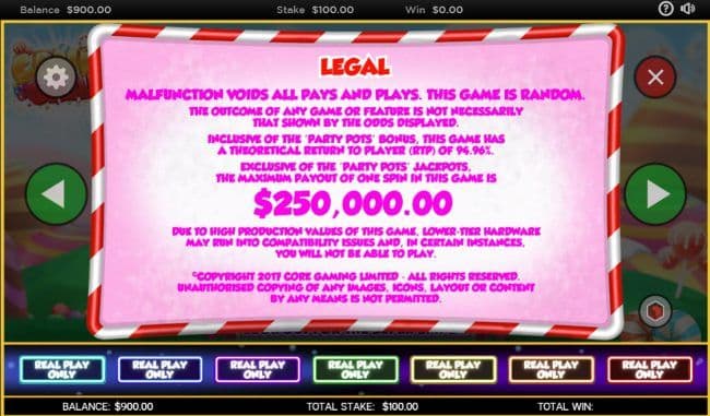 As with other 5 reel online slots, the Candy Grab slot is neat to play. The Core Gaming guys worked a lot of effort to make a game this good experience. Using symbols like game logo, lollipop, hard candy and jelly beans can place you in the sweet treats experience. Like all the other online slots there is a great chance of cashing out big but cash out your winnings before you lose them.