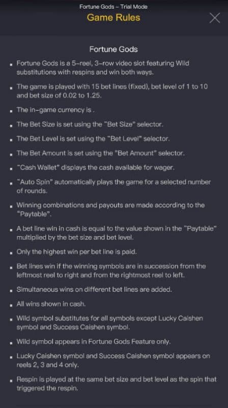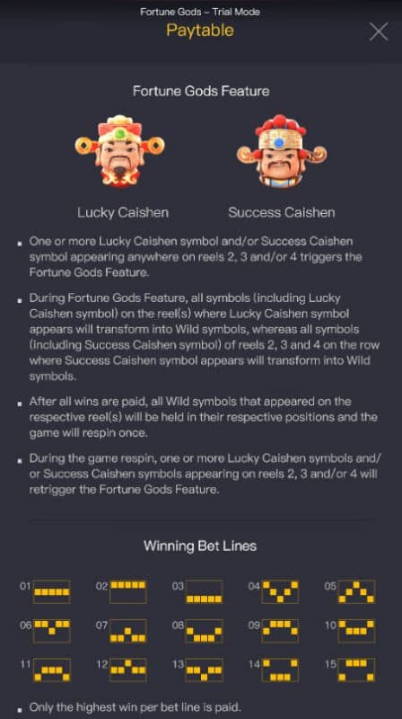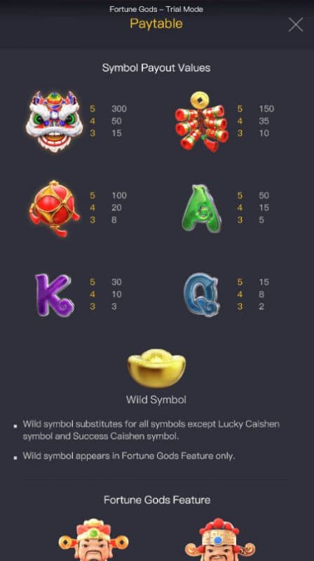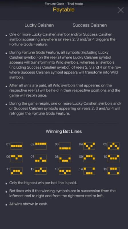 We believe the feature piece of Fortune Gods is very good. Here is the information on the extras you can win. I enjoy the Fortune Gods Fortune Gods Wild Feature as well as the fun it delivers. This starts once you get one or more lucky Caishen and/or success Caishen symbol appearing anywhere on reels 2, 3 and/or 4. The Respin is triggered by getting the conclusion of the Fortune Gods Wild Feature, this bonus game seems to produce very good. I have to assign Fortune Gods 5 of 5 stars for the bonuses. The chance that you can collect far beyond your wager is a great part of bonus features.