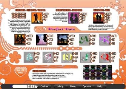 Perfect Date offers you 30 paylines over 5 reels and incorporates a beach date wild symbol, Paris date scatter, free spins and the Steamy shower extra wild. The pretense for the Perfect Date is set among the laneways and romantic cafes that are found in the city of love, Paris.